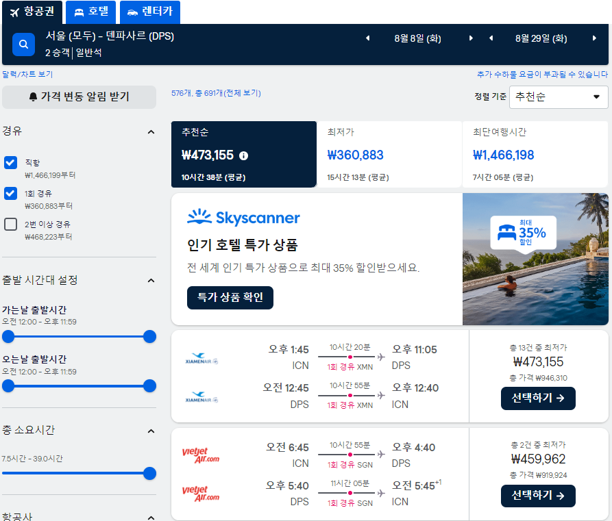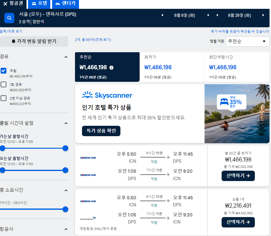 스카이스캐너로 3주일정으로(8월 9일-8월 29일) 왕복 항공편 비교해보았습니다